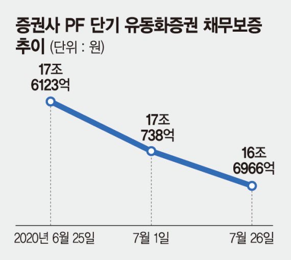 28일 금융투자업계에 따르면 지난 26일 기준 증권사들의 PF 채무보증 규모는 16조6966억원으로 집계됐다. 지난 6월 25일 채무보증 규모가 17조6123억원인 것을 고려하면 한 달 만에 1조원 가까이 줄었다.