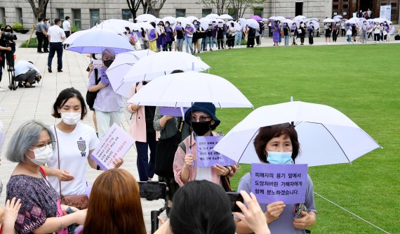한국성폭력상담소, 한국여성의전화 등 8개 여성단체로 구성된 '서울시장 위력에 의한 성폭력사건 국가인권위 직권조사 촉구 공동행동(이하 공동행동)'이 28일 직권조사 요청에 앞서 피해자와 연대를 상징하는 보라색 우산을 들고 시청 광장을 둘러싸는 퍼포먼스를 펼치고 있다. 사진=박범준기자