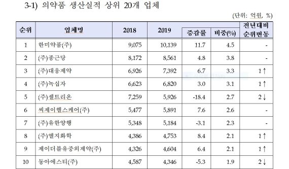 지난해 의약품 생산실적 기준으로 한미약품 생산액은 1조139억원으로 2018년과 같이 1위 자리를 지켰다. 종근당(8561억원)도 2위를 유지했다. 대웅제약(7392억원), 녹십자(6820억원)는 2018년 보다 각각 1순위씩 오른 반면 셀트리온(5926억원)은 2계단 하락하며 5위를 기록했다.
