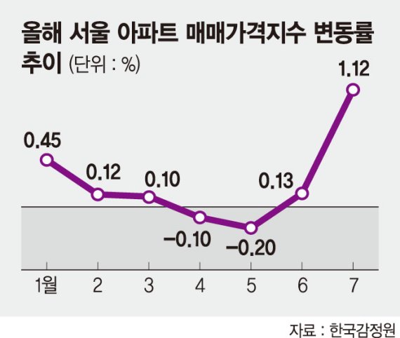 3일 한국감정원의 7월 전국주택가격동향조사 결과에 따르면 7월 서울 아파트값 변동률은 전달 대비 1.12% 증가해 올 들어 가장 높았다. 지난 해 12·16대책 이후 1월 0.45%, 2월 0.12%, 3월 0.10%로 둔화되던 서울 아파트값 변동률은 코로나19가 본격화된 4~5월에는 마이너스로 돌아서 진정되는 듯 보였다.