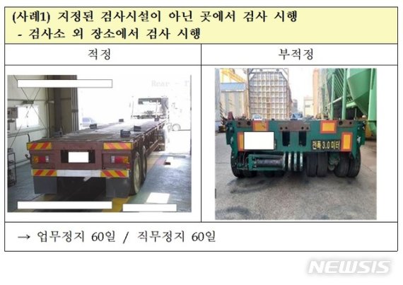 위반사항은 검사항목의 일부 생략이 9건(45%)으로 가장 많았다. 제원 변경을 확인하지 않거나 외관 및 기능 검사, 제동력 검사 등을 생략해 관련 규정을 위반했다.