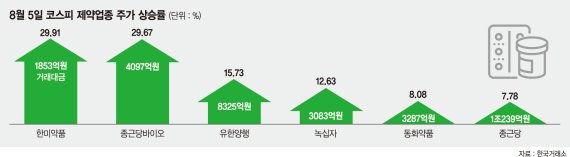 5일 한국거래소에 따르면 이날 코스피 의약품 업종은 전 거래일보다 6.33% 오르며 전체 업종 가운데 가장 높은 수익률을 기록했다. 거래량도 전업종에서 가장 많았다.