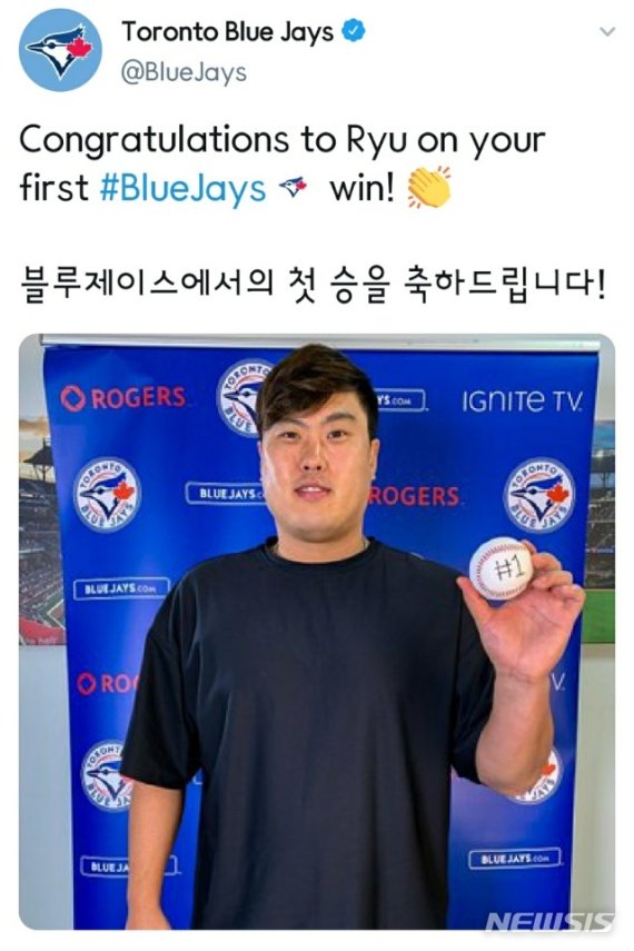 류현진이 승리를 올리자 토론토는 구단 공식 소셜네트워크서비스(SNS)에 'Congratulations to Ryu on your first #BlueJays win!'이라는 문장과 함께 한글로 '블루제이스에서의 첫 승을 축하드립니다!'는 축하 인사를 남겼다.