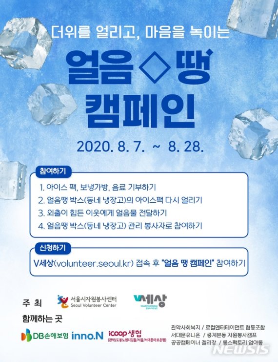 온라인 자원봉사 'V세상' 이런 활동 어때요 페이지에서 참여 신청이 가능하다. 이번 얼음 땡 프로젝트는 운영기간이 지난 이후에도 각 지역과 단체들이 연결돼 늦더위까지 운영될 수 있도록 진행된다. 이후에도 이웃을 함께 살피는 '사회적 고립 해결-이제는 외롭지 않아요! 캠페인'도 펼쳐진다.