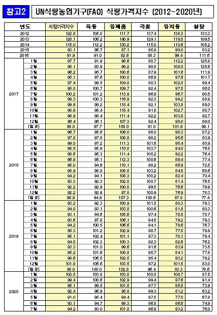 농림축산식품부는 10일 국제연합(UN) 식량농업기구(FAO) 세계식량가격지수가 7월 94.2포인트를 기록하며 전월 대비 1.2%, 전년 대비 1% 상승했다고 밝혔다. 지난 6월 93.2포인트로 올 들어 처음으로 상승했던 세계식량가격지수는 7월까지 두 달 연속 상승했다.