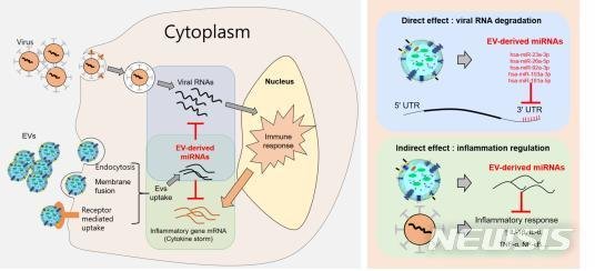또 마이크로RNA가 코로나 바이러스의 증식을 억제함과 동시에 뛰어난 항염증 효능을 갖고 있어 중증 코로나19 환자들의 대표적인 증상 가운데 하나인 과잉 면역반응으로 인한 사이토카인 폭풍을 막는 효과가 있다는 점을 발견했다.