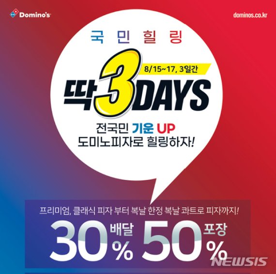 [서울=뉴시스] 김동현 기자 = 도미노피자는 광복절 연휴를 맞아 '국민힐링 딱 쓰리 데이즈' 프로모션을 진행한다고 13일 밝혔다.