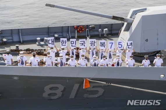 14일 해군 제1함대사령부에 따르면 강원함 승조원들은 함미갑판에서 '대한민국 광복 75년'이라고 새긴 글자판과 태극기를 흔들며 광복절을 축하했다.