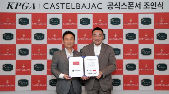 지난 18일 경기도 성남시 분당구 KPGA 빌딩에서 '까스텔바작 신인상(명출상)’ 2년 연장 계약을 체결한 뒤 KPGA 구자철회장(오른쪽)과 까스텔바작 권영숭대표가 포즈를 취하고 있다. /사진=KPGA