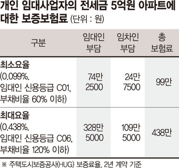 보험료는 HUG의 아파트 보증금 보험 기준으로 '전·월세 보증금의 0.099~0.438%'로 책정됐다. 서울 아파트 평균 전세금(7월 기준)인 5억원을 기준으로 보면 2년간 총보험료는 99만~438만원이다.