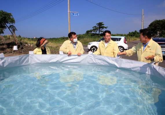 [제주=좌승훈 기자] 올 여름 제주지역에 역대 최장의 장마(49일·6월10일~7월28일)에 이어 낮 최고기온이 35도를 오르내리는 폭염 특보가 3주째 이어지고 있는 가운데 안동우 제주시장이 19일 제주시 애월읍 양배추 정식 현장을 방문해 농경지 폭염 대책 추진상황을 점검했다. 안 시장은 이날 물 공급 상황을 확인하고, 관계 공무원들에게 양수장비 대여와 공공용 물백 설치·급수탑 개방 등 농업용수 공급에 차질이 없도록 선제적 조치를 취해 나갈 것을 당부했다. [사진=제주시 제공]