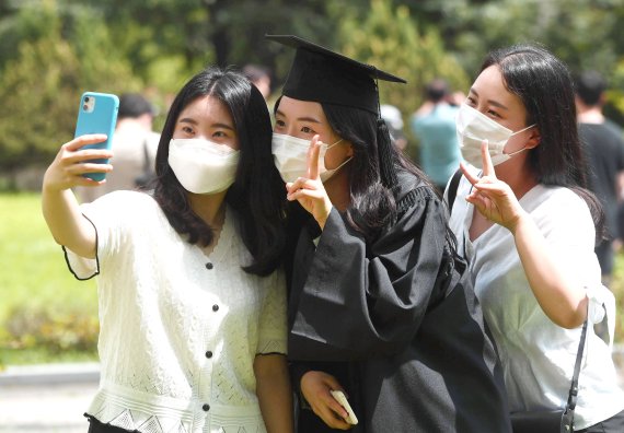 대학들은 통상 8월말 진행하는 후기 졸업식을 코로나 확산 우려로 취소했다. 19일 서울 능동로 세종대학교에서 졸업생들이 마스크를 쓰고 기념촬영을 하고 있다.
