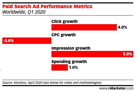 디지털 시장조사기관 이마케터에 따르면 2020년 1·4분기 전세계 검색광고의 CPC는 지난해 같은 기간보다 3% 하락한 것으로 나타났다.