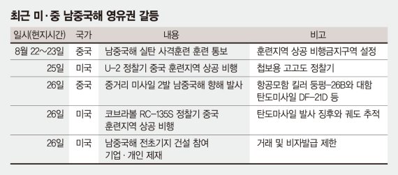 미국은 전날 중국이 실탄 훈련 중인 남중국해 상공으로 정찰기를 재차 띄우기도 했다. 지난 25일(현지시간)에 이어 이틀 연속이다. 중국이 자신들의 훈련 해상 상공을 비행금지구역으로 설정해 놓고 훈련 기간 동안 비행을 금지한다고 통보했는데, 보란 듯이 정찰기를 보낸 것이다. 미국의 이 같은 제재는 중국의 남중국해 군사훈련과 관계가 있다.