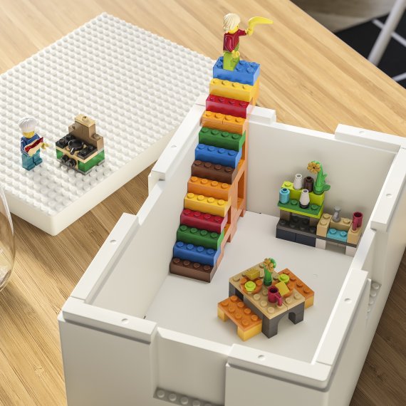뷔글레크는 수납장과 레고를 결합한 박스 형태의 가구다. 레고 스터드(원형 돌기)가 제품 상단과 앞면에 부착돼 아이들이 레고로 다양한 놀이를 즐기며 자신이 만든 작품을 전시하고 수납도 할 수 있다. 제품에 포함된 레고 브릭 외 다른 레고 세트와도 완벽하게 호환된다.