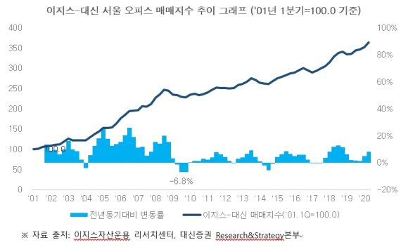 이지스자산운용과 대신증권은 2020년 2·4분기 ‘이지스-대신 서울 오피스 매매지수’가 364.1포인트로 전분기 대비 3.4%, 전년 대비 8.4% 올랐다고 28일 밝혔다.