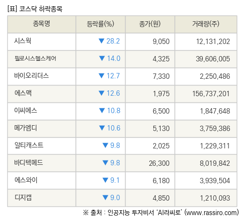 [fnRASSI]장마감, 코스닥 하락 종목(시스웍 -28.2% ↓)