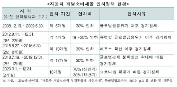 보고서는 정부가 침체된 경기를 활성화하는 정책수단으로 '자동차 개별소비세율 인하'를 자주 활용했지만, 오락가락하는 정책은 소비자 신뢰를 떨어뜨려 효과가 반감될 수 있다고 봤다.