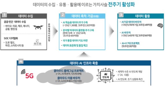 데이터댐 사업은 미국 대공황 시기의 후버댐 건설과 같이 일자리와 경기부양 효과를 꾀하기 위해 기획된 것으로 Δ인공지능(AI) 학습용 데이터 구축 ΔAI 바우처 ΔAI데이터 가공바우처 사업 ΔAI융합 프로젝트(AI+X) Δ클라우드 플래그십 프로젝트 Δ클라우드 이용바우처 사업 Δ빅데이터 플랫폼 및 센터 구축으로 구성돼 있다.