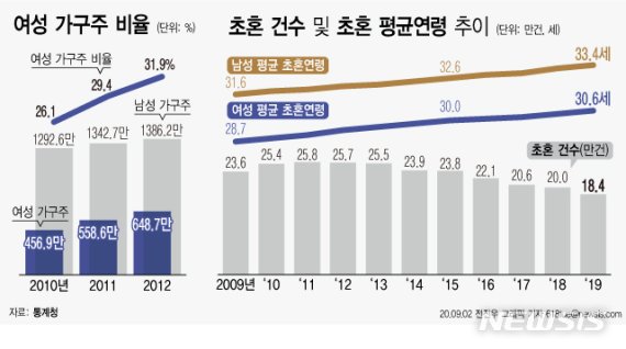 통계청의 장래가구특별추계에 따르면 올해 여성이 가구주인 가정 수는 648만7000가구로 전체의 31.9%였다. 2010년 대비 5.8%포인트 상승했으며, 2040년에는 37.8%로 상승세가 지속될 전망이다.