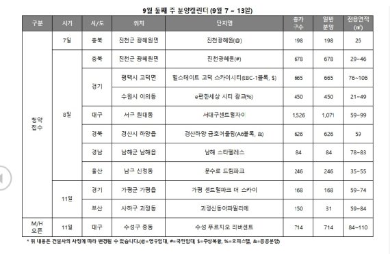 당첨자 발표는 ‘포레나 순천’, ‘e편한세상 김포 어반베뉴’, ‘KTX강릉역 동도센트리움’ 등 13곳에서 실시된다. 계약은 ‘DMC SK뷰 아이파크 포레’, ‘센텀 센트레빌 플래비뉴’ 등 15곳에서 진행된다.