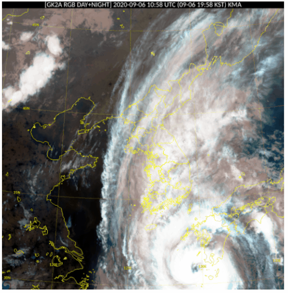 천리안위성 2A호를 통해 본 제10호 태풍 '하이선'의 모습. 하이선으로 인한 비구름이 이미 우리나라를 뒤덮고 있는 모습을 확인할 수 있다. 기상청 제공.
