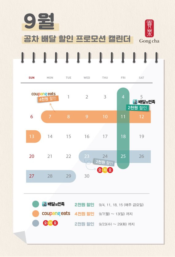 공차는 지난 3월 배달 서비스 범위를 대폭 확대한 이후 배달의민족, 요기요 등 주요 배달 앱에서 꾸준히 프로모션을 진행해오고 있다. 이번 달에는 무려 3개의 배달 앱을 통해 거의 매주 공차 할인 혜택을 제공한다.