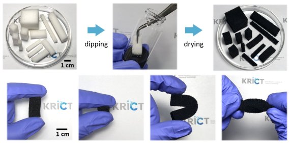 하지만 소재 자체가 완전히 유연한 건 아니었다. 압력을 가하면 부서지는 것도 문제였다. 이런 이유로 열전소재를 고무 기판에 넣어 사용해야 했다. 이번에는 아예 스펀지로 열전소재를 만들어 이 같은 문제를 해결한 것이다.