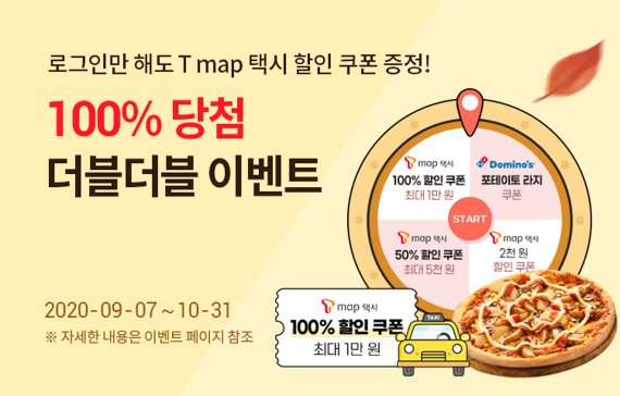 도미노피자는 홈페이지에 로그인한 만 19세 이상 회원 중 차수별 선착순 2만 명을 대상으로 T map 택시 1000원, 3000원 할인 쿠폰을 랜덤으로 증정한다. 참여 방법은 해당 이벤트 페이지에서 할인 쿠폰 코드 받기를 누르고 티맵 택시 애플리케이션에서 코드를 등록하면 할인 쿠폰을 발급받을 수 있다.