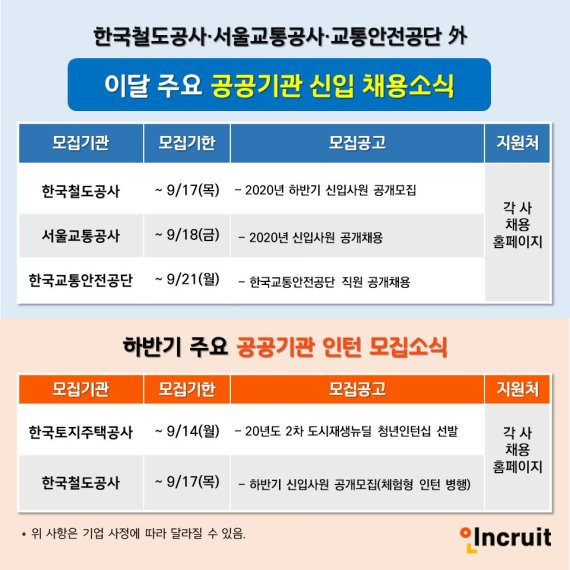 [파이낸셜뉴스] 이달 삼성, CJ, KT, LG 등 주요 대기업에서 하반기 대졸신입 채용을 시작한 데 이어 주요 공공기관에서도 신입 모시기에 나섰다. 9월 현재 한국철도공사, 서울교통공사, 한국토지주택공사, 교통안전공단 등 주요 공사 및 공단에서 대졸 신입사원과 인턴을 모집 중이다. 특히 공공기관은 채용직무별 규모 또한 구체적으로 명시된 만큼, 구직자들의 적극적인 지원이 요구된다. 11일 취업포털 인크루트가 이달 모집중인 공공기관 하반기 채용소식을 전한다.