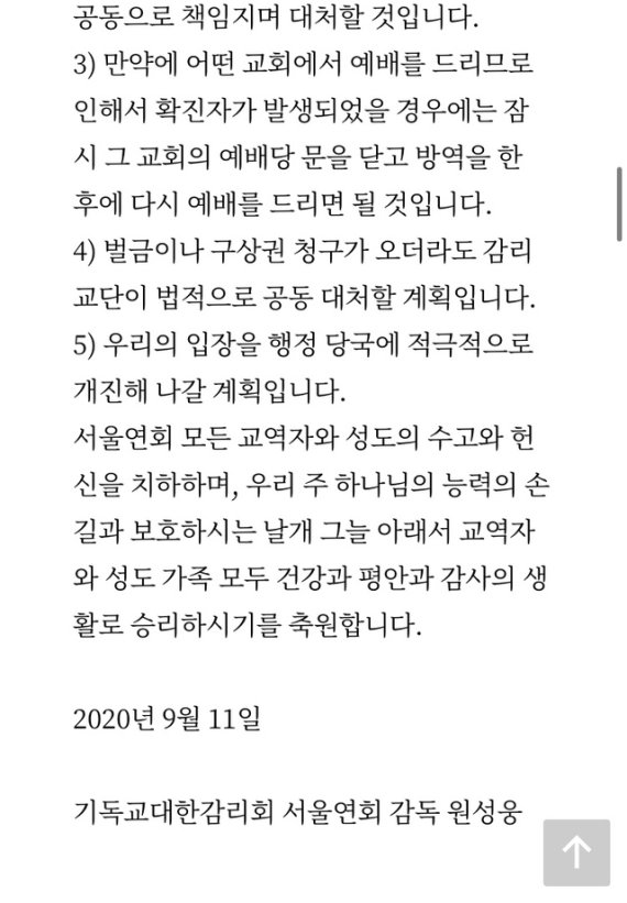 그러면서 "사실은 교회가 전염병 예방을 위해 가장 잘 협조하고 모든 방역 준칙들을 잘 지켜왔는데도, 현 정권에 대해 비판적인 소수의 교회들과 광화문 광장에 모였던 기독교인들에게 매우 의도적으로 책임전가를 하고 있다는 소문이 널리 퍼지고 있다"고 주장했다.