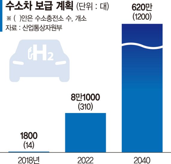 이에 따라 정부는 수소경제 활성화를 위해 내년 예산을 올해 4297억원 대비 39.3% 늘린 5986억원을 편성했다. 산업통상자원부가 수소 생산기지 구축 등에서 2540억원, 환경부가 수소차 보조금·수소충전소 등의 사업에 4400억원을 투입한다. 정부는 수소차와 에너지 생산에서 세계시장 점유율 1위를 달성하기 위해 2022년까지 수소승용차 6만5000대, 수소트럭 2000대를 보급하고 광주와 창원에 각 1곳씩의 중규모 수소생산기지를 설치할 계획이다. 이렇게 되면 현재 대산, 울산, 여수와 함께 5곳의 수소 생산기지를 확보하게 된다.