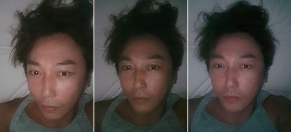 사진 속 탁재훈은 침대 편안하게 누운채, 잠들기 전 자신의 모습을 사진으로 담아내고 있었다.
