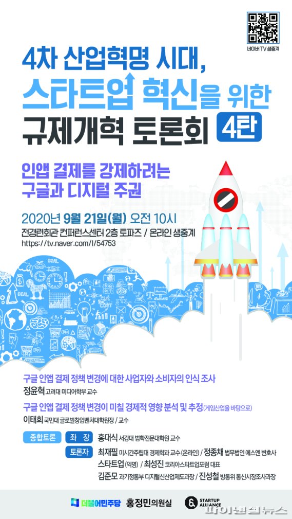 이번 토론회는 ‘4차산업혁명 시대, 스타트업 혁신을 위한 규제개혁 토론회’ 시리즈 네 번째다. 정윤혁 고려대 미디어학부 교수가 첫 발제자로 나서 구글 인앱결제 정책 변경에 대한 사업자와 소비자 인식조사 결과를 발표한다. 또 국민대 글로벌창업벤처대학원장 이태희 교수가 게임 산업을 바탕으로 추정한 이번 정책 변경의 경제적 영향에 대해 발표한다.