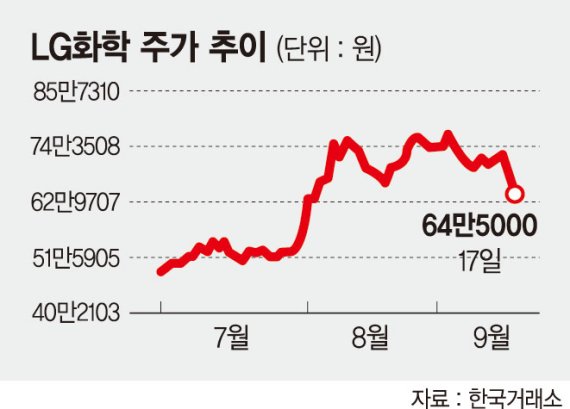 17일 한국거래소에 따르면 LG화학 주가는 전일대비 6.11% 하락한 64만5000원에 거래를 마쳤다.