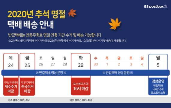 한편 추석연휴 전 반값택배를 제외한 GS포스트박스 편의점택배 서비스는 오는 9월 25일(금) 수거가 마감(제주지역은 9월24일(목) 마감)이 되며, 10월 5일(월)부터 수거 및 배송이 재개된다.