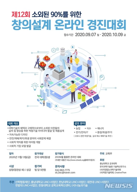 교육부가 주최하고, 충남대 등 7개 기관이 주관하는 대회로 '과학기술로부터 소외된 이웃의 삶의 질 향상을 위한 적정기술 아이디어와 아이템 발굴'이 목적이다. 오는 11월 13일, 충남대에서 열린다.