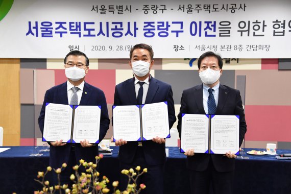 서울시는 28일 오전 9시 30분, 중랑구·SH공사와 함께 '서울주택도시공사 중랑구 이전을 위한 협약'을 체결했다고 29일 밝혔다. 협약식에는 김학진 서울시 권한대행 직무대리, 류경기 중랑구청장, 김세용 서울주택도시공사 사장이 참석했다.