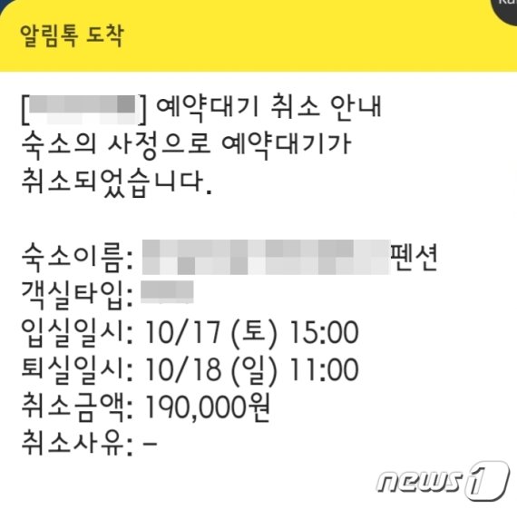 숙박 앱을 통해 받은 카카오톡 메시지는 ‘숙소의 사정으로 예약대기가 취소되었습니다’라는 내용이었다. 메시지 하단에 ‘취소사유’란은 공백이었다. A씨는 영문도 모른 채 취소된 일정에 허탈했다.