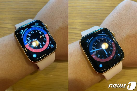 애플워치5에서 처음 탑재됐던 AOD 기능은 애플워치6에서 2.5배 더 밝아졌다. 다만 밝은 곳에서는 그 차이가 확연히 드러나지는 않았다.