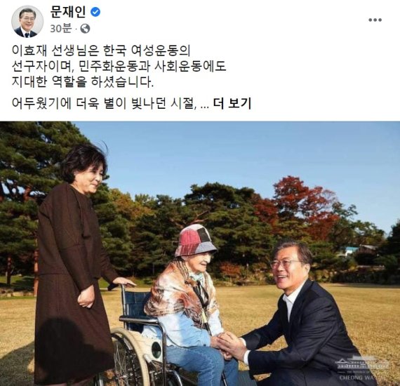 문 대통령은 이날 이 명예교수의 별세 소식을 접하고 사회관계망서비스(SNS)에 올린 글을 통해 "이효재 선생님은 한국 여성운동의 선구자이며, 민주화운동과 사회운동에도 지대한 역할을 하셨다"며 "어두웠기에 더욱 별이 빛나던 시절, 큰 별 중 한 분이셨다"고 추모했다.