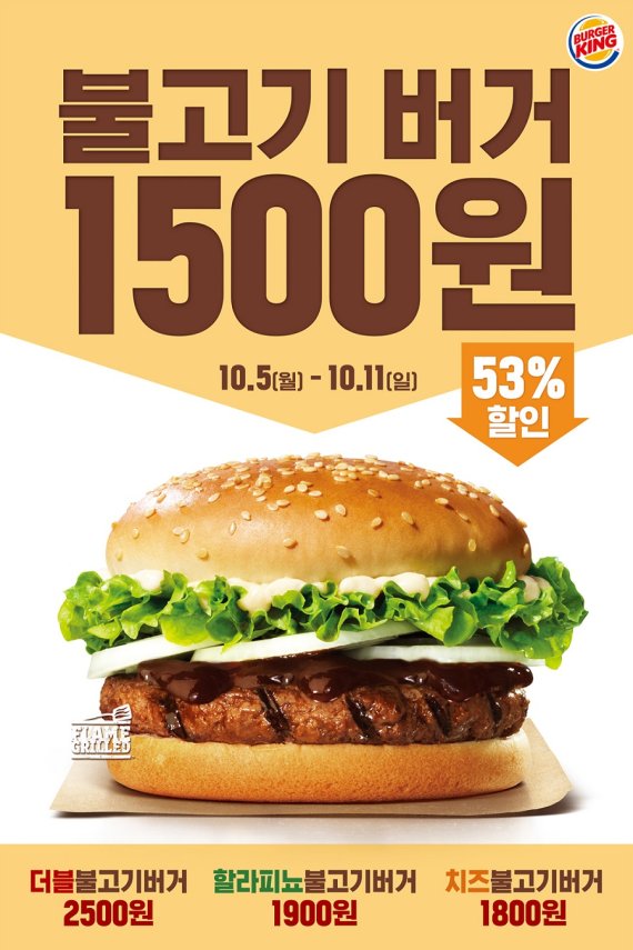 [파이낸셜뉴스] 브랜드 버거킹이 11일까지 '불고기버거' 단품을 53% 할인된 1500원에 판매하는 프로모션을 실시한다고 6일 밝혔다.