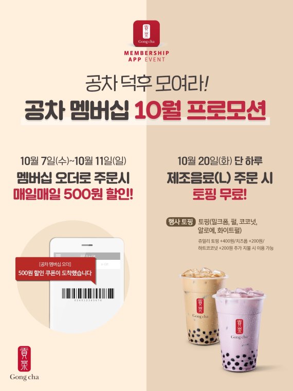 [파이낸셜뉴스] 공차코리아가 10월 한 달 동안 멤버십 회원들을 대상으로 두 가지 프로모션을 진행한다고 6일 밝혔다. 매달 진행하는 멤버십 데이 외에 추가 프로모션을 기획해 회원들에게 혜택을 제공한다.