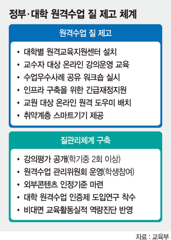 대학은 원격교육지원센터를 설치·운영하고, 교원의 원격교육 역량 강화를 위한 온라인강의 운영 교육을 실시한다. 특히 교직원, 전문가뿐 아니라 학생도 참여하는 원격수업관리위원회를 운영하고 원격수업 강의평가를 학기 중 2회 이상 실시해 대학이 자율적으로 질적 관리체계를 갖추도록 했다.