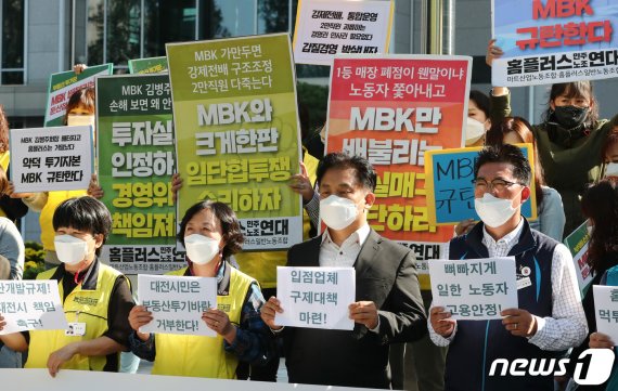 이들은 6일 대전시청 북문 앞에서 기자회견을 열고 "MBK가 둔산점과 탄방점을 폐점하고 주상복합 건물을 짓는 것에 대해 규탄한다"고 밝혔다.