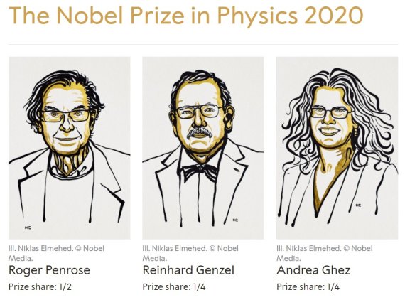 (서울=뉴스1) 김승준 기자,조소영 기자 = 2020년 노벨물리학상은 블랙홀의 존재를 이론적으로 증명한 로저 펜로즈(Roger Penrose·89) 영국 옥스퍼드대 교수와 관측으로 그 존재를 확인한 라힌하르트 겐젤(Reinhard Genzel·68) 독일 막스플랑크 외계물리학연구소장과 앤드리아 게즈(Andrea Ghez·55) 미국 로스앤젤레스 캘리포니아대(UCLA) 교수에게 돌아갔다.