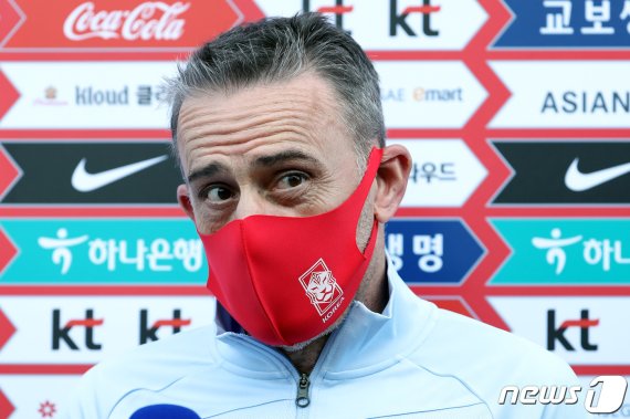 (파주=뉴스1) 임성일 기자 = A대표팀 입장에서는 다소 부담스러운, 올림픽대표팀(U-23대표팀) 동생들과의 친선경기를 앞두고 있는 파울루 벤투 축구대표팀 감독이 '결과'보다는 '자신들이 세운 계획 속의 한 과정'에 집중하겠다는 뜻을 밝혔다. 당연히 승리를 위해 최선을 다하겠으나 그렇다고 연연하지는 않겠다는 자세였다.