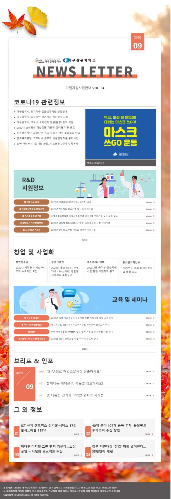 이몽락 R&D지원팀장은 "최근 웹봇 등을 통해 자동적으로 정보를 수집, 발송하는 뉴스레터가 많다"면서 "하지만 대구경제플러스 뉴스레터는 다양한 기업지원기관의 정책정보를 지역산업에 해박한 대구상의 정보담당자가 직접 업계에서 필요로 하는 산업동향뿐만 아니라 '코로나19' 등 이슈에 대응하는 정책정보를 검색, 체계적으로 정리하여 제공한다”며“향후에도 지역 기업들이 필요로 하는 정보를 다양한 콘텐츠로 제공할 계획"이라고 말했다.