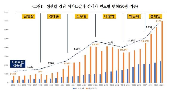 정권별 강남 아파트 전세가 변동폭은 김영삼 정부(1193~1998년)에서 평당 100만원(30평형 기준 0.3억원), 김대중 정부1998~2003년) 평당 310만원(0.9억원)이 상승했다. 노무현 정부(2003~2008년)에서는 평당 279만원(0.8억원)이 올랐다. 이명박 정부(2008~2013년)는 평당 462만원(1.4억원), 박근혜 정부(2013~2017년)에서는 평당 666만원(2억원)이 올랐다.