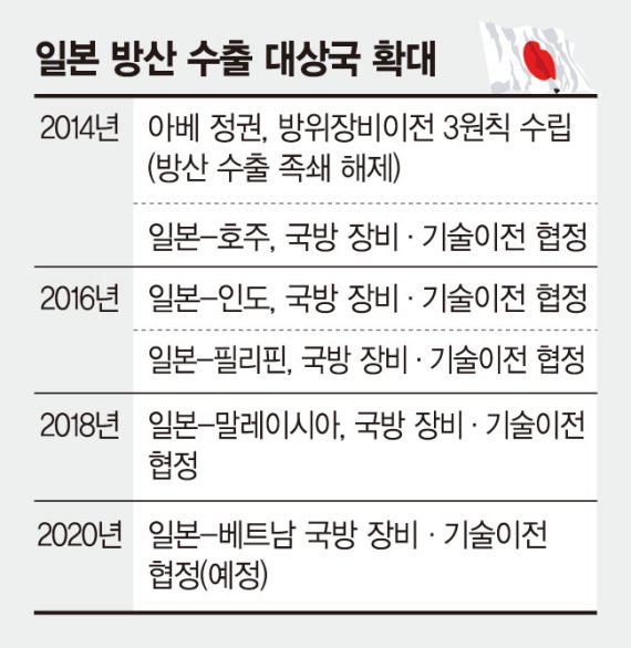 일본이 방산 수출에 본격 나선 것은 개헌을 먼저 추진했던 아베 정권 때인 2014년 부터다. 당시 아베 신조 총리는 무기와 관련기술 수출을 원칙적으로 금지한 '무기 수출 3원칙'을 대체하는 '방위장비이전 3원칙'을 제정했다. 무기 수출 족쇄를 푸는 조치다. 분쟁 당사국이나 유엔 결의 위반국에 무기 수출을 금하되, 일본 안보에 기여하는 경우, 수출시 적정한 관리 확보가 가능한 경우 수출을 허용한다는 것이 골자다.